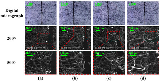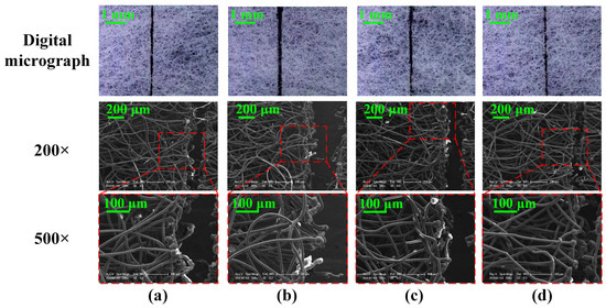 To explore the effect of laser scanning speed on the surface morphology of non-woven fabric, four representative images at different scanning speeds with frequency controlled at 40 kHz are obtained (Figure 3). It can be seen from the digital micrographs that the kerf width decreases with the increase in scanning speed. While the scanning speed is higher than 600 mm/s, the non-woven fabric is not completely cut off. By comparing the SEM images (200× and 500×) of the kerf of non-woven fabric at different scanning speeds, it can be found that the scanning speed has a significant impact on the kerf structure. Figure 3a displays that as the scanning speed is 400 mm/s, long and thin carbonized pellets appear at the margin of the kerf because the laser processing time of the single point and the energy absorbed is increased in the reaction region, resulting in the increase of the number of fuses [22]. In the meantime, the spherical structure formed by melting evaporation is more complex, and the density and surface carbonization degree increase significantly, which eventually contributes to a larger kerf width [23]. As shown in Figure 3c,d, some spinning and winding connections still exist in the middle of the fracture, and the non-woven fabric is not completely cut off. This is mainly because the high scanning speed results in a decrease in the melting quality of the non-woven fabric [24]. Figure 3b exhibits the images of the non-woven fabric when the scanning speed is controlled at 500 mm/s. It can be seen that the degree of carbonization and density of the spherical structure is moderate. Moreover, the kerf on the surface is orderly and leads to a smooth touch, showing great significance in realizing the efficient cutting of non-woven fabric.