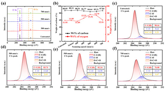 Apart from surface morphology, the proportion of chemical element content in the kerf of non-woven fabric at different laser scanning speeds is experimentally determined (Figure 4). Slight data fluctuations can be seen as the normal error margin in the measurement. Four representative samples processed using different scanning speeds are selected to conduct the XPS analysis. Before the analysis, all spectra were charge-shifted to confirm the accuracy of the data. As shown in Figure 4a, the main elements with high energy density are mainly C and O, and the binding energies of C 1s and O 1s are 284.8 and 532.1 eV. Meanwhile, the elemental contents of C and O are measured, as demonstrated in Figure 4b. It is presented that scissor cutting has no effect on the change of chemical element content. With the increase of scanning speed, the proportion of element carbon (C) decreases first and then increases and reaches the least value (84.64%) at the scanning speed of 500 mm/s while the content proportion of element oxygen (O) reaches the peak value (15.36%). This is mainly attributed to the thermal decomposition reactions, which can be divided into two stages, and oxidation reactions, which occur when the non-woven fabric is cut by laser [25,26,27,28]. The first stage is the thermal decomposition reactions of the main chain of polyester macromolecules, and the products are mainly carboxylic acid and vinyl ester. At this stage, the C-C(H) bonds in the main chain macromolecules break and combine with oxygen to form C-O bonds, ether bonds, and O-C=O, which corresponds to the downward trend of the content of C-C(H), as shown in Figure 4c–f. With the further increase of the energy absorbed by the non-woven fabric, the second stage is the further decomposition of the benzene and the unstable initial carbon layer, and the products are mainly CO2 and H2. Besides, the intensity of C1’s peaks shows obvious variation. The content of C-O reached a maximum value (22.25%) at the scanning speed of 700 mm/s compared with the speeds of 300 and 500 mm/s. This is mainly due to the energy absorption of the C-O bond formed in the first stage: the C-O breaks to reform free C and O and recombines to form new products such as terephthalic acid [27]. The recoil pressure generated during the process of gas escape makes the edge of the non-woven fabric curl inward. Under the condition that the scanning speed is higher than 500 mm/s, the energy absorbed by the fabric is insufficient for the reactions of the second stage reaction, resulting in the decreased degree of the thermal decomposition reaction and the reduction of the amount of generated gas. The absorbed energy of the fabric is enough while the scanning speed is lower than 500 mm/s, leading to a decreased decomposition degree of the initial carbon layer and contributing to the increase of C atom content and almost no change in O atom content [29].
