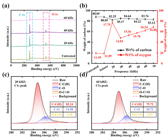 In addition, the proportion of chemical element content in the kerf of non-woven fabric, as shown in Figure 6, is measured for XPS analysis. As shown in Figure 6a, similar to Figure 4a, the main elements of non-woven fabric at different frequencies are C and O. It can be seen from Figure 6b that with the increase of frequency, the proportion of element C fluctuates and reaches the peak value (85.17%), while the proportion of element O reaches the least value (14.83%) at the frequency of 30 kHz. In the meantime, the content of C-C at 20 kHz and 60 kHz exhibits a significant decline compared with that of the untreated non-woven fabric. This is mainly related to the pulse energy absorbed at a single point of the non-woven fabric. The single pulse energy and power density reach the peak value at the frequency of 30 kHz, and thus the thermal decomposition reaction mainly occurs at the first stage resulting in an increase in the decomposition degree of the terephthalic acid [32]. The high decomposition degree of the terephthalic acid leads to an increase in the amount of generated CO2 gas. At this time, the content of C and O decreases, and the change in the proportion of O content becomes more distinct, which shows that the proportion of C content increases while the proportion of O content decreases compared to that of 20 kHz. While the frequency further rises to 40 kHz, the energy absorbed by the fabric is reduced, leading to a further reduction of the degree of oxidation reaction and thermal decomposition reaction. The number of vinyl ester and terephthalic acid produced by the decomposition of the main chain of polyester macromolecule is decreased, contributing to the content change as shown in Figure 6. The experimental result further exhibits the importance of reasonable control of laser processing parameters for the efficient cutting of non-woven fabric.