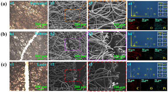 To verify the effectiveness of the laser cutting technique developed in this work, the surface morphology and chemical contents obtained by scissor cutting and laser cutting are measured for analysis and comparison. As demonstrated in Figure 7(a1–a3), the surface of the untreated non-woven fabric consists of lines intertwined with each other, and there is no fracture. Figure 7(b1–b3) shows the characterization results of the surface morphology for the non-woven fabric cut by scissors. It can be seen that an obvious kerf appears on the non-woven fabric, which has been completely cut off under the effect of shear force. The cutting section is uneven, and the surface roughness is low. In addition, the fibers of the non-woven fabric show high flatness after being cut by the scissors, and there is no spherical structure formed by melting evaporation on the kerf. When the non-woven fabric is cut by laser, it can be observed that the kerf appears flatter, and the kerf width is relatively narrow. Furthermore, there are some carbonized pellets generated on the kerf of the non-woven fabric due to the thermal effect of laser ablation (Figure 7(c1–c3)), and reducing the degree of carbonization is the key to improving the flatness and feeling of the kerf [33,34].