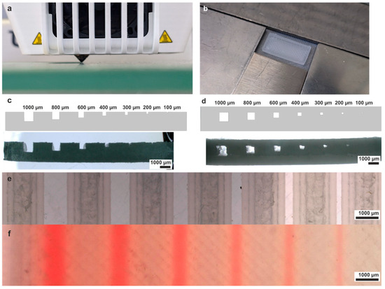 Fused deposition modeling of PVDF and optimization of the printing parameters. (a) The second extruder nozzle, which was the default setup for the Ultimaker 3, was removed in order to place a metal frame around the printed part. (b) The metal frame presses onto the brim and decreases the chance of warping during the printing. (c) CAD file and 3D-printed part of the calibration structure used for optimizing the wall infill flowrate for open 3D-printed channel structures. Open channels as small as 200 µm × 200 µm were successfully fabricated. (d) CAD file and 3D-printed structure of the calibration structure used for optimizing the wall infill flowrate for embedded 3D-printed channel structures. Embedded channels down to 200 µm × 200 µm were successfully fabricated. (e) Top view on open channel structures demonstrating that structures down to 200 µm × 200 µm were successfully fabricated. (f) Top view on embedded channel structures filled with dyed water. All channels down to 200 µm × 200 µm were functional and successfully filled.