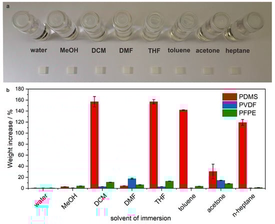 Assessment of chemical resistance of FDM-printed PVDF. (a) Blocks of PVDF (10 mm × 10 mm × 3 mm) after 24 h immersion in the respective solvents. Experiments were conducted in sets of three. No structural damage was observed after the swelling. (b) Mean weight increase and standard deviation of the immersed PVDF blocks compared to cast and cured PDMS and PFPE methacrylates.
