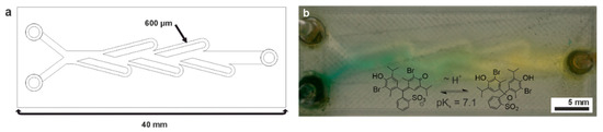 FDM fabrication of a 3D-printed Tesla mixer. (a) Schematic of the Tesla mixer design. The minimum outer channel width and height is 600 µm. (b) Three-dimensionally printed Tesla mixer and reaction scheme. The chip was filled with 10 mM p-toluenesulfonic acid in DMF mixed with 0.1 mM bromothymol blue and 1 mM triethylamine in DMF. Moreover, 1:3 (vol/vol) water is added to the latter solution in order to express the blue color of bromothymol blue.