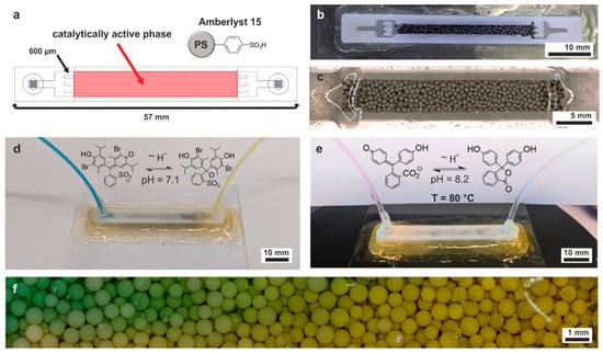 An advantage of FDM when 3D printing microreactors for reaction-on-chip applications is the possibility of incorporating a catalytically active phase within the chip by utilizing a print–pause–print protocol. Before fabrication of the roof layers, the print is paused and the chamber is filled with any heterogeneous catalyst. The particles are fixed within the perfusion chamber with a 3D-printed sieve structure, which consisted of several pillars with a width of 800 µm and a gap width of 600 µm in between. Amberlyst 15 was chosen as a heterogeneous catalyst, which is a commercial ion exchange resin, composing sulfone groups grafted onto crosslinked PS (Figure 5a). Although being sold mainly for ion exchange operations, Amberlyst 15 has seen widespread usage as a heterogeneous catalyst for acid-catalyzed reactions. For instance, it has been shown to catalyze transesterification [41], Michael addition [42], or Friedel–Crafts reactions [43]. Nevertheless, these examples utilize Amberlyst 15 suspended inside a stirred batch reaction, whereas it has not been used in a continuous 3D-printed microreactor, which effectively overcomes the mandatory catalyst separation step. A linear flow cell was designed with a perfusion chamber with a length of 30 mm, a width of 5 mm, and a height of 4 mm (Figure 5a). While fabrication, the print is stopped twice. The first time, the brim of the structure is fixed with epoxy glue to a glass plate. This ensures that the 3D-printed microreactor can be heated on a hot plate due to full contact with the planar ground and does not require a water heat bath. Due to the high temperature of the print bed, the polymerization of the epoxy glue is finished before the print is complete, preventing any structural change after printing. Prior to printing the roof layers, the print is stopped a second time, and the catalytically active phase is added to the perfusion chamber (Figure 5b). As Amberlyst 15 swells in solvents, the swelling factor of the solvent of choice has to be calculated prior to filling the chamber in order to fill out the whole perfusion chamber in the swollen state. After fabrication, the microreactor was perfused with distilled water, and the pH value at the reactor outlet was measured with a pH test strip. A neutral pH value was observed, which indicates no leakage of the active phase. Therefore, this reactor can be utilized to conduct any acid-mediated reaction (similar to the chip in Figure 4b). As stated, PVDF is not transparent due to its semi-crystalline structure. As this restricts optical analysis within the reaction chamber, we also designed a microreactor with an open channel structure. The design with 3D-printed roof featured sloped wall structures to aid printing of the roof, whereas no slope is required when sealing the channel with a glass slide. After the print is finished, a hot glass plate is pressed on top of the open perfusion chamber and sealed with epoxy glue (Figure 5c). This way, optical analysis within the perfusion chamber is only limited by the optical properties of the glass slide. The 3D-printed microreactor was filled with the same 3:1 (vol/vol) DMF/water mixture from Figure 5d to demonstrate the color change in bromothymol blue upon protonation.