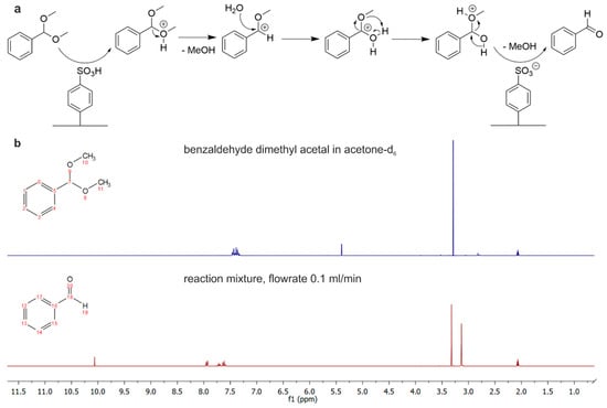 As a demonstration of a heterogeneously catalyzed reaction, the chip was used for an acid-catalyzed deprotection of acetals to aldehydes. This reaction plays a vital role in orthogonal carbonyl chemistry, as aldehydes have a high reactivity and therefore often require protection during a series of chemical transformations of the respective molecule [44,45]. Usually, the reaction is performed under homogeneous conditions, which require an additional separation step to isolate the product [46]. However, if the reaction is performed on-chip, the product can be conveniently collected at the reactor outlet in a one-step process. The chip was filled with a solution of 2 mM benzaldehyde dimethyl acetal in acetone and 0.15 vol% water at a flowrate of 0.1 mL/min at 20 °C. The dimethyl protection group is catalytically cleaved in acidic media within the chip (Figure 6a). The reaction was run in acetone-d6 to allow direct 1H-NMR measurement of the reaction mixture (Figure 6b). Analysis was performed on a Bruker Avance III HD 300 MHz NMR spectrometer. The reaction is monitored by the disappearance of the methine acetal proton at position 7 at f1 = 5.40 ppm. Alternatively, the reaction can be monitored by the evolution of the aldehyde proton signal at position 19 at 10.06 ppm. The starting material proton signal disappeared completely, indicating a conversion of more than 99%. This demonstrates that the 3D-printed microreactors can be conveniently used for common reactions in organic chemistry that conventional FDM thermoplasts would restrict.