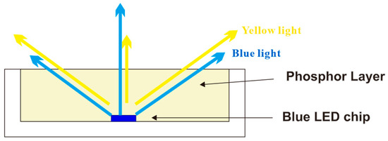 Light-emitting diodes (LEDs) are ubiquitous due to their high efficiency, long lifetime, low energy consumption, and environmental friendliness. There are two main approaches to generating white light with LEDs. One method involves mixing emissions from multiple colored LEDs, such as red, green, and blue, in suitable proportions. The other approach uses phosphors to downconvert blue LED emission into longer wavelengths, producing white light through color mixing. In general, phosphor-converted LEDs (pcLEDs) are predominantly used in the generation of white light because of their simple structure and low cost in mass production [1,2]. A portion of the blue light from a blue LED chip is converted by yellow phosphor to generate yellow light, and white light is produced by mixing the blue and yellow lights. However, specific problems still limit the use of pcLEDs in solid-state lighting applications, such as a low angular color uniformity (ACU) or the yellow ring effect [3,4]. The yellow ring effect can be attributed to the phosphor layer in the package. Longer excitation optical paths at larger angles lead to the conversion of more yellow light, and this additional yellow light at the perimeter of the LED reduces ACU, as shown in Figure 1. Furthermore, because of the large refractive index differences between the encapsulating materials and the air, considerable amounts of blue and/or converted yellow light are trapped within the package because of the total internal reflection effect. The trapped light either escapes from the side of the platelet or is reabsorbed and converted to heat, both of which reduce forward light emission. This phenomenon reduces lumen output and further exacerbates the yellow ring effect in pcLEDs.