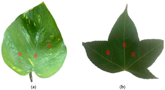 Figure 2. Photographs of the leaves used in the study. (a) Epipremnum aureum and (b) Acer serrulatum, with marked regions indicating areas selected for surface microstructure analysis.