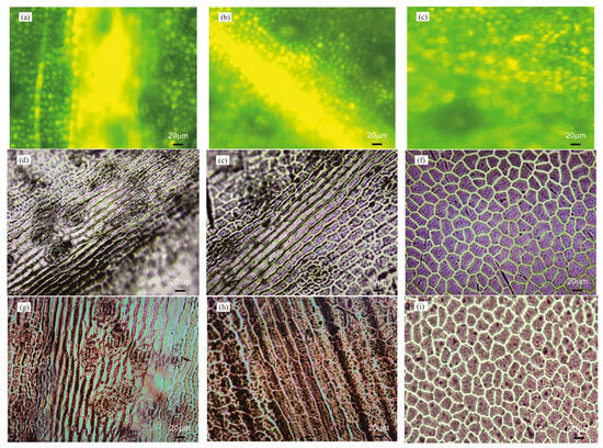 Figure 4. Optical microscope images of the surface morphologies of (ac) Regions A, B, and C from Acer serrulatum, (df) their respective inverse UV-curable resin replicas, and (gi) their respective positive replicated PDMS films.