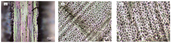 In our experiments, leaf surface microstructures were applied onto the phosphor layer of pcLEDs. Specifically, these leaves were used as a master template to fabricate a patterned microstructure onto the phosphor layer of pcLEDs. For the use of leaf surface microstructures on pcLEDs to enhance angular color uniformity, selecting leaf structures of appropriate size is essential. Therefore, common plants with medium-sized leaves from Northern Taiwan were chosen for this study. The size and morphology of the surface microstructures were also key factors for effective replication. Two different plants from Northern Taiwan, Epipremnum aureum and Acer serrulatum, were selected on the basis of their surface microstructure sizes (20–50 μm) and distinct morphological features. To investigate the influence of varying leaf surface microstructures on optical properties, we selected three distinct regions from the same leaf of two different plants for imprinting fabrication, as shown in Figure 2a,b. Region A refers to the part of the leaf where the petiole connects the leaf to the stem. Region B represents the area around the leaf veins, where the vascular tissue is most prominent. Region C is the section of the leaf that is free from both the petiole and veins, consisting of the broader, uninterrupted surface of the leaf blade. These regions were chosen to explore the potential differences in microstructure between areas with varied surface morphologies. By selecting regions that include structural differences, such as the presence of vascular tissue (Region B) and areas with smooth, uninterrupted leaf surfaces (Region C), we can better understand how different microstructural features affect light absorption, reflection, and other optical properties.