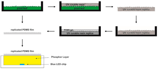 Figure 3a–c and Figure 4a–c present photographs of the original Epipremnum aureum and Acer serrulatum leaf surfaces from regions (A), (B), and (C), which were captured using a Nikon Eclipse Ci-S upright clinical microscope. To maintain their natural surface features and avoid dehydration artifacts, the leaves were freshly picked immediately before each replication process. The fresh leaves were cleaned with ethanol and dried with pressurized air to remove any moisture. The selected plant leaf was cut into small pieces of approximately 2 cm × 2 cm, and a piece was fixed to a clean Petri dish using double-sided adhesive. To replicate surface microstructures, a polyurethane acrylate (GC251, Everwide Chemical Co., Yunlin County, Taiwan) ultraviolet (UV)-curable resin was used. The UV-curable resin was slowly poured onto the selected leaf piece and cured under UV light. After the UV-curable resin was fully cured, it was peeled off, revealing a high-fidelity inverse replica of the Epipremnum aureum and Acer serrulatum leaves’ structural membrane, as shown in Figure 3d–f and Figure 4d–f. Subsequently, the leaf surface microstructures were fabricated on a PDMS film by using the first inverse UV-curable resin replica as an imprint stamp. Two-component PDMS gel (Sylgard 184, Dow Corning, Midland, MI, USA), with a weight ratio of 10:1 (elastomer to crosslinker), was uniformly mixed and slowly poured onto the inverse UV-curable resin replica, coating the Petri dish. The sample was heated in an oven at 120 °C for 1 h to cure the thin PDMS film, and the replicated PDMS film was peeled off from the first inverse UV-curable resin replica. The leaf microstructures were then reversely transferred from the first inverse UV-curable resin replica onto the surface of the replicated PDMS film. Figure 3g–i and Figure 4g–i depict the microstructures formed on the high-fidelity replicated PDMS films of Epipremnum aureum and Acer serrulatum. The photographs reveal that the positive microstructures formed on the replicated PDMS films accurately reproduced the leaf surface topology. To ensure that the optical characteristics for different plants were comparable, all replicated PDMS films were fabricated with a thickness of approximately 0.4 mm. To apply the leaf surface microstructures on the phosphor layer of pcLEDs, the same blue LED chips and the same amount of phosphor mixed with silicone encapsulant were used in this study. Additionally, PDMS was used as the encapsulant for pcLEDs. The blue LED chips, with a chip size of 1 mm × 1 mm and a wavelength of 450 nm, were mounted on the commercial plastic lead-frame package. A commercial YAG:Ce phosphor (YAG4EL, Intematix, Fremont, CA, USA) was dispersed in PDMS gel, uniformly stirred, and dispensed to fill up the lead-frame package cup. After the phosphor layer was cured in an oven at 120 °C for 1 h, the prepared replicated PDMS film was covered on the top surface of the pcLEDs. The schematic process flow for fabricating leaf surface microstructures on the phosphor layer of pcLEDs is shown in Figure 5.