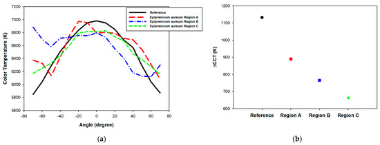 Figure 6. (a) Angular CCT and (b) ΔCCT of pcLED with and without Epipremnum aureum surface microstructures applied to phosphor layer.