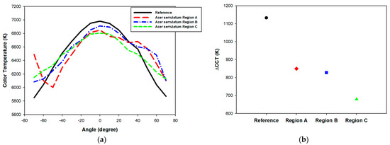 Figure 7. (a) Angular CCT and (b) ΔCCT of pcLED with and without Acer serrulatum surface microstructures applied to phosphor layer.