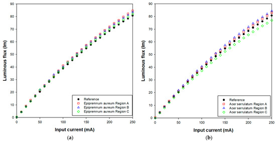 To further understand the optical performance of the pcLEDs with different leaf surface microstructures, the current-dependent luminous flux was measured. The optical characteristics of the pcLEDs were evaluated using a source meter (PSM-3004, Good Will Instrument Co., New Taipei City, Taiwan), a photodetector connected to an optometer (S380, OSI Optoelectronics, Hawthorne, CA, USA), and a compact spectrometer (Ocean SR2, Ocean Optics Inc., Orlando, FL, USA) integrated with a 30 cm integrating sphere. As shown in Figure 8a, the luminous flux of the pcLEDs with various Epipremnum aureum surface regions increased by 1.8% to 5% at a driving current of 250 mA; the luminous flux of the pcLEDs with various Acer serrulatum surface regions increased by 2.7% to 4.4% at a driving current of 250 mA, except Region C (as shown in Figure 8b). Specifically, Region A shows the highest increase, followed by Region B and Region C. This enhancement in luminous flux can be attributed to the ability of the leaf surface microstructures to improve light extraction efficiency by scattering light more effectively at different angles, reducing internal reflection losses. The surface structure near the petiole (Region A), characterized by a dense and fibrous micro-pattern, plays a significant role in increasing light scattering, leading to the highest luminous flux increase. This structure directs more light outward, preventing it from being trapped inside the phosphor layer, and demonstrates the most notable improvement in luminous output. In contrast, Region B, located around the leaf veins, features a more structured yet varied micro-pattern. This arrangement promotes enhanced light scattering, leading to a noticeable, but slightly less pronounced, increase in luminous flux compared to Region A. Meanwhile, Region C, characterized by its smoother and more homogeneous surface, provides the lowest but still significant improvement in luminous flux. The smoother microstructures in this region may be less effective at scattering light compared to the more complex micro-patterns in Regions A and B. The overall increase in luminous flux across all regions indicates that leaf surface microstructures, especially those with more complex and fibrous patterns, play a critical role in enhancing the optical performance of pcLEDs by improving light extraction and scattering, thereby boosting luminous output. Although the current-dependent luminous flux of the pcLEDs with Acer serrulatum surface microstructures (Regions A to C) follows a similar trend to those with Epipremnum aureum, distinct differences can be observed. As shown in Figure 7b, only Regions A and B of Acer serrulatum show an enhancement in luminous flux compared to the reference pcLED. Region B exhibits the highest improvement, followed by Region A, with both regions enhancing the luminous output. In contrast, Region C presents a lower luminous flux than the reference sample, deviating from the trend observed in the other regions. This reduction in luminous flux for Region C may be due to imperfections in the inverse UV-curable resin replicas and the replicated PDMS films of Acer serrulatum, produced via the imprinting technique. These surface irregularities likely diminish the light extraction efficiency by disrupting the light scattering process, resulting in a lower luminous output than the reference pcLED, despite the smoother and more homogeneous microstructure of Region C.