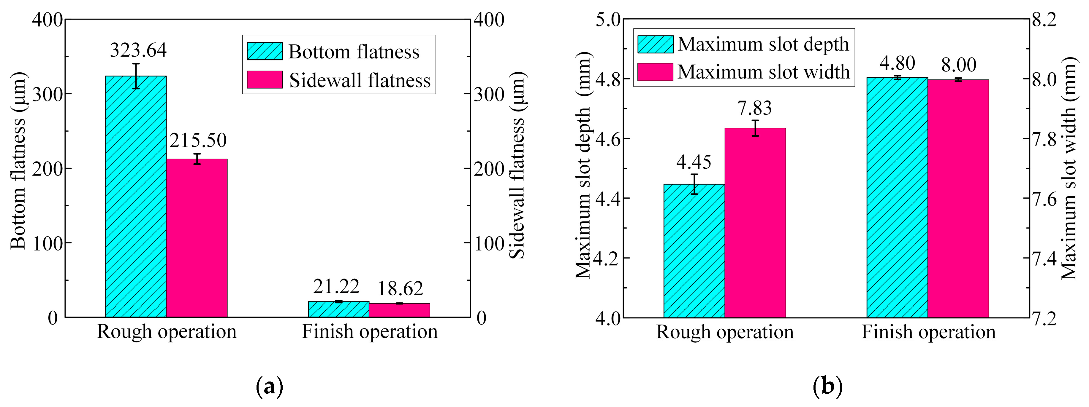 - In comparison with rough machining, both the surface flatness and quality of the slots significantly improved after the finish machining. The bottom flatness and sidewall flatness were reduced by 93.4% and 91.2%, respectively. Furthermore, the surface roughness of the bottom and sidewall surfaces was reduced by 90.6% and 80.1%, respectively.