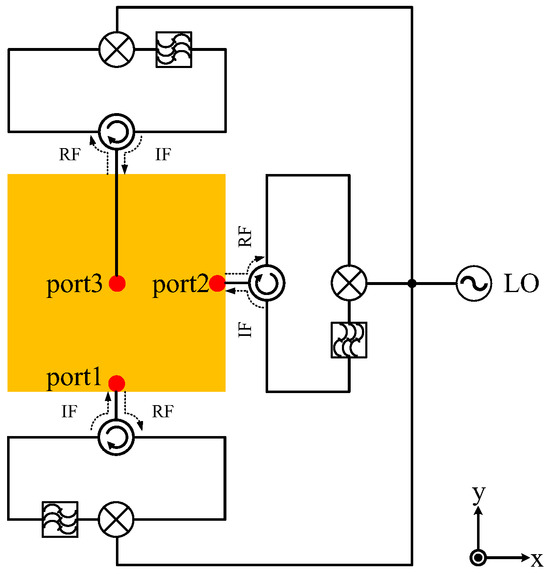 If we assume an incoming signal is applied to a mixer with a local oscillator (LO) running at , then the desired output of the mixer is and the phase of the incoming signal is automatically conjugated. If each phase conjugation circuit is well-designed and meets Equations (5) and (6), the fully polarimetric retrodirective array is made based on a PON structure. It is not as strict as a linearly polarized RDA, whose placement posture requires complete alignment, and allows for changing postures in application. In addition, conformal array forms can be adopted to expand its applications.