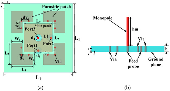 Structure of the tri-polarized antenna. (a) Top view. (b) Side view. (L1 = 19 mm, L2 = 7.8 mm, L3 = 6 mm, d1 = 2 mm, d2 = 0.51 mm, d3 = 0.5 mm, dv = 2 mm, s = 0.5 mm, W1 = 2.5 mm, h = 1.5 mm, hm = 7.5 mm, Lf = 3.5 mm).