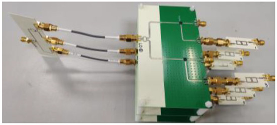 The receiving and retransmitting elements are designed separately to replace the circulator, which makes the structure of the phase conjugation circuits much simpler. The photograph of the fully polarimetric phase conjugate circuit is shown in Figure 4. The phase conjugation circuits comprise six channels, each of which includes a 9.6 GHz bandpass filter and a MAMX-011036 Double-Balanced Mixer (Mansfield, TX, USA). Finally, they all connect to a local oscillator at 19.2 GHz through a one-to-two Wilkinson power divider and a one-to-three Wilkinson power divider. The leakage of the RF-IF and LO-IF mixers was measured to be 9 dB and 40 dB, respectively, and the frequency conversion loss was measured to be 10 dB.