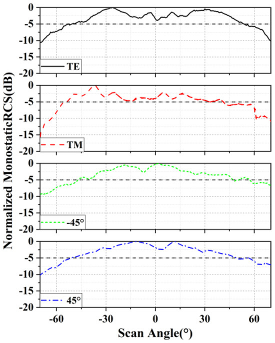 In order to analyze the fully polarimetric retrodirectivity, the monostatic RCS test was implemented with different polarized incident waves. As shown in Figure 7, when the polarization direction of the incident wave is perpendicular to or inside the incident plane (yoz plane), it is defined as a TE or TM incident plane wave, respectively. When the polarization direction of the incident wave forms an angle of 45° or −45° with respect to the incident surface, it is marked as a 45°- or −45°-polarized plane wave, respectively.