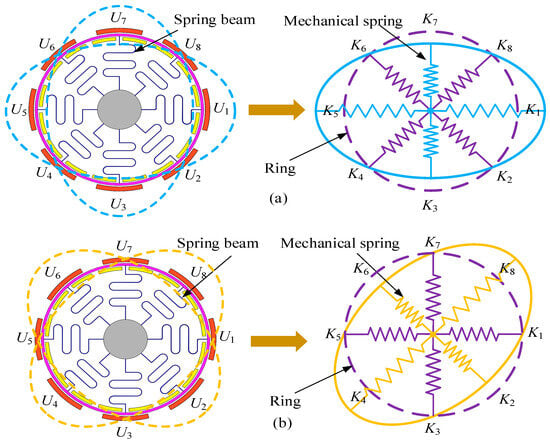 Figure 2. Diagram of the Drive Mode and Sense Mode of a Ring Gyroscope. (a) Drive mode. (b) Detection mode.