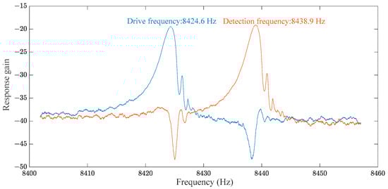 The quality factor is a critical parameter for measuring energy loss in the resonant motion of the MEMS gyroscope. A higher (Q) value indicates lower energy loss in the gyroscope’s resonant mode, resulting in more stable and enduring motion. The gyroscope head used in this test is shown in Figure 2. A higher quality factor indicates that the MEMS gyroscope has lower energy loss and can maintain a high mechanical quality factor during resonant motion, which is essential for improving detection accuracy and the long-term stability of the system [3,13]. The frequency sweep result of the MEMS gyroscope head used this time is shown in Figure 3.