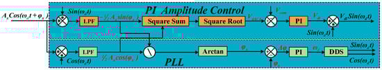 Next, the readout signal is multiplied and demodulated with the reference signals ( S i n ω o t ) and ( C o s ω o t ) through step ➁, ensuring that the phase difference between the AC drive signal and the detection signal is maintained at 90°. Through this process, the amplitude and phase information of the gyroscope signal are extracted. The amplitude signal is ( 1 / 2   V _ d a c ), and the phase signal is ( φ x ). A digital resolver ➂ processes these signals, performing trigonometric operations and low-pass filtering. Subsequently, the ( 1 / 2   V _ d a c ) signal (at stage ➃) is compared with the reference voltage ( V r e f ). Then, a PI controller ➅ generates a control signal, which is modulated with ( C o s ω o t ). This signal is superimposed via V D C ➈ and converted differentially (through step ➉) before being applied to the differential drive capacitor terminal of the gyroscope. At the frequency control loop, the phase signal is input into step ➄, where it is processed by a PI controller ➅. The resulting control signal is then sent to the VCO frequency generator, which produces the corresponding reference signals ( S i n ω o t ) and ( C o s ω o t ) [15].