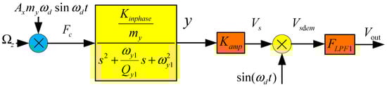 where mx and my are the drive mode equivalent mass, sense mode equivalent mass and Coriolis mass; x and y1 are drive mode displacement, sense in-phase mode displacement and sense anti-phase mode displacement, respectively; Qx2 and Qy1 are drive mode quality factor, sense in-phase mode quality factor and sense anti-phase mode quality factor, respectively; Ωz is angular rate input; Fdx is drive mode stimulating magnitude; ωd is drive mode stimulating frequency; and y1 is total sense mode displacement, which gives us [6,14]: