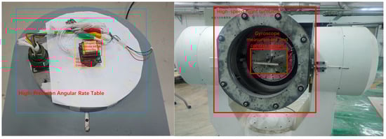 When the driving voltage of the gyroscope is maintained at 10.85V, the driving mode displacement of the gyroscope is 5 μ m, and the sensitivity ratio of the gyroscope detection mode is 0.01091 mV/°/s. After the MEMS gyroscope measurement and control system stabilizes, the team uses a high-precision angular velocity turntable to calibrate and test the gyroscope. The STZ-2A single axis position rate turntable with an accuracy of 0.001°/s and a testing range of up to 350°/s is used to support the calibration of angular rate sensors. We selected the following angular velocity values for calibration testing: ±300°/s, ±200°/s, ±100°/s, ±50°/s, ±20°/s, ±10°/s, ±5°/s, ±2°/s, ±1°/s, ±0.5°/s, ±0.2°/s, ±0.1°/s, ±0.05°/s, ±0.02°/s, ±0.01°/s, and ±0.005°/s. The installation method of the gyroscope measurement and control system is shown in Figure 9, which is installed at the center of the turntable to ensure accurate capture of angular velocity changes during the testing process and reduce the influence of external interference on the results.