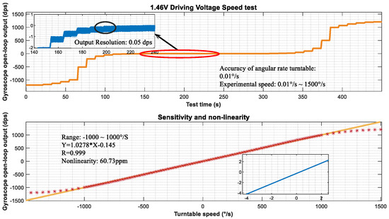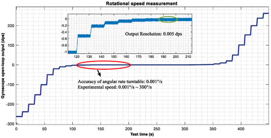 As a comparative verification test, the driving voltage of the measurement and control system was adjusted to 1.46 V, and the vibration displacement of the gyroscope driving mode in the current state was 1 μm, with a sensitivity ratio of 0.002197 mV/°/s. The testing uses a SJT series three-axis precision angular motion turntable with an angular velocity control accuracy of 0.01°/s and an input range of ±1500 °/s, providing support for the calibration of angular velocity sensors. The installation diagram of the measurement and control system is shown in Figure 9. The following angular velocity values are selected for calibration testing: ±1500°/s, ±1000°/s, ±500°/s, ±200°/s, ±100°/s, ±50°/s, ±20°/s, ±10°/s, ±5°/s, ±2°/s, ±1°/s, ±0.5°/s, ±0.2°/s, ±0.1°/s, and ±0.05°/s. The installation method of the gyroscope measurement and control system is shown in Figure 12, which is installed at the center of the turntable. The experimental results are shown in Figure 12. Under the control of a driving voltage of 1.46 V, the minimum output resolution is 0.05 dps. Within the effective range of ±1000 °/s, the linear relationship of the gyroscope output can be expressed as Y = 1.0278   X 0.145 , with a minimum resolution of 0.05138°/s and a nonlinearity of 60.73 ppm. The gyroscope expanded using the range extension technology mentioned in this article does not change the system response time of the gyroscope itself, so the response time is the same as that of the open-loop detection loop of the gyroscope.