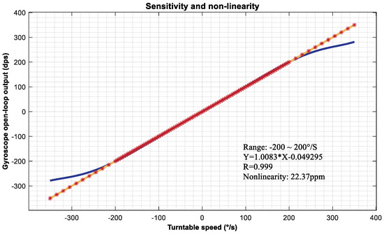 The fitting results of the system output and input angular velocity are shown in Figure 11. Within the range of ±200°/s, the output of the gyroscope measurement and control system can be fitted as ( Y = 1.0083 X 0.049295 ), where X is the input angular velocity and B is the static offset term. The nonlinear calculation formula is δ = max Y i Y ¯ Y F s × 100,000 = 22.37   ppm . This indicates excellent performance within this range, capable of achieving high-precision linear output. Outside the range of ±200°/s, the system output exhibits extremely poor nonlinearity, so the current measurement and control system range is only ±200°/s.