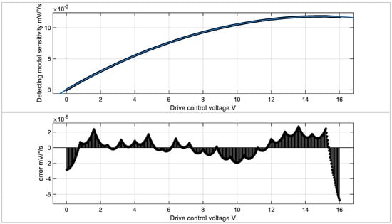 Further experimental fitting analysis shows that within the drive voltage range of 0–15 V, the relationship between the drive voltage and the gyro sensitivity can be accurately fitted using the cubic polynomial equation: y = 6.862   *   10 9 x 3 5.291   *   10 5 x 2 + 0.001576   *   x + 2.817   *   10 5 . The fitting quality is as high as 0.9999, with system residuals not exceeding ( 10 4 ). This fitting equation indicates a corresponding relationship between the drive voltage and sensitivity, providing a mathematical basis for the precise calibration and optimization of the system.