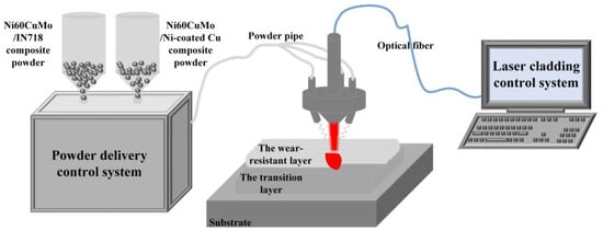 0.5, with a sharp increase in the heat-affected zone (HAZ), before decreasing rapidly in the substrate region. As the Cu content increased, the hardness of the wear-resistant layer decreased. For the C1 coating without the Ni-coated Cu, the average hardness of the wear-resistant layer was close to that of the transition layer. However, the difference in hardness between the wear-resistant layer and the transition layer became more pronounced with the increasing Cu content in the C2–C4 coatings. According to the mixture rules of composite materials, the addition of soft phases like Cu to the hard materials decreased the overall hardness of the coating [
