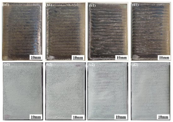 Figure 4, the microstructural dimensions of the lower area were generally larger than those of the upper area. The lower area contained more and larger columnar grains, while the upper area had a more compact and finer microstructure. This phenomenon of grain refinement from the bottom to the top of the coating is known as the “skin effect” during the laser cladding process [
