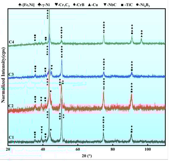 31]. The increase in Cu content in the wear-resistant layer is beneficial to the toughness and lubrication properties of the coating, and improves its crack resistance and wear performance. Moreover, many square and spherical particles were observed in these wear-resistant layers, and the EDS data results indicated the significant enrichment of the Ti, Nb, and C elements within these particles, which were considered to be the TiC- and NbC-reinforced phase eutectics, with the results shown in the XRD of