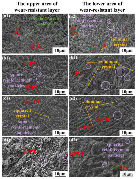 Figure 4, it is obvious that the microstructures within the transition layer of each coating exhibited a denser and finer morphology. In all four transition layers of the studied coatings, small square particles (such as P3 and P5) were present, as listed in