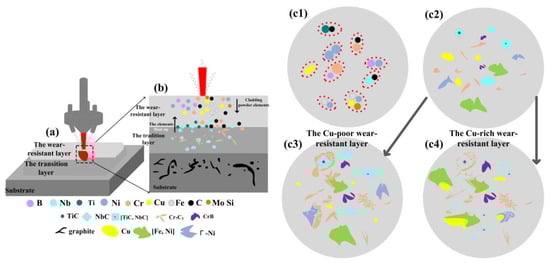 Figure 5(c1,c2), the elements floating up from the transition layer and the cladding powder reacted transiently in the molten pool and formed the reinforced phases, such as TiC, NbC, Cr7C3, CrB together with γ-Ni, [Fe, Ni] solid solution, and Cu in the solid solution state. However, the microstructures of the wear-resistant layers with the different Cu contents were affected by Cu segregation, resulting in different morphologies. In