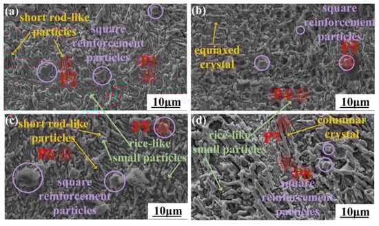 Figure 6 depicts the microstructural characteristics in the transition layer region of the four studied composite coatings, and the EDS results of certain characteristic structures are listed in