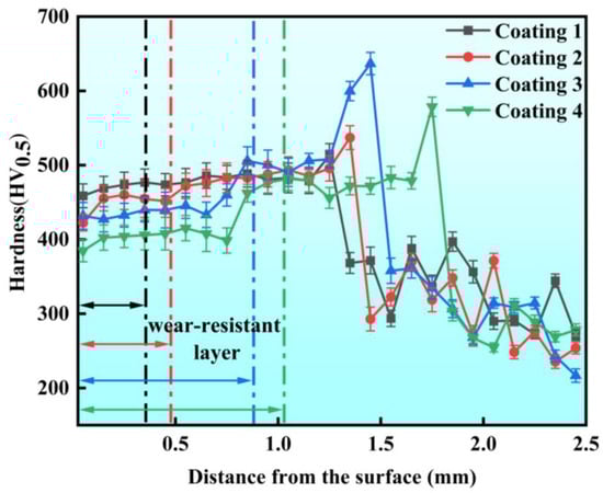 Figure 7. This is attributed to the re-diffusion of the elements during the secondary remelting of the transition layer. The pre-formed carbides in the transition layer were melted during the laser cladding process of the wear-resistant layer and participated in the molten pool reactions. These carbides provided additional carbon atoms to the wear-resistant layer. The diffusion of the elements led to more carbide phases precipitating at the bottom of the wear-resistant layer, resulting in the formation of more dendritic hard phases in the lower region of the wear-resistant layer and a steady increase in the hardness in the interface region, as shown in