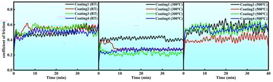 The coefficient of the friction (COF) curves of the four coatings with different Cu contents at room temperature (RT), 300 °C, and 500 °C are shown in