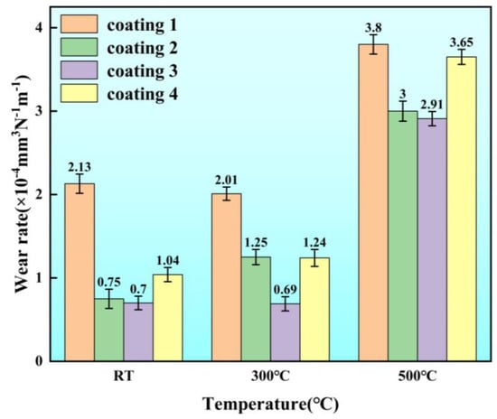Figure 9 shows the wear rates of each coating at room temperature, 300 °C, and 500 °C. It can be observed that the wear rate initially decreased and then increased with the increase in Cu content. The C3 coating exhibited the lowest wear rate of 0.70 × 10