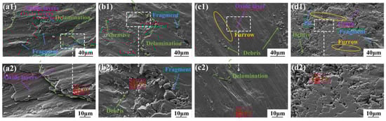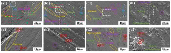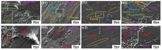 Figure 12 show the worn morphologies at RT, 300 °C, and 500 °C, where a2–d2 is the enlarged part of the white box in a1–d1 and