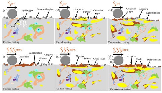Figure 10(a1)). Additionally, a large amount of wear debris was generated on the coating surface during the RT wear process. The debris was caused by the micro-bulge on the coating surface at the beginning of the wear process as well as by the fracturing and spalling of the coating during the wear process. These wear particles led to the main wear mechanism of all the coatings, which was abrasive wear. In the Cu-rich coatings, the high Cu content provided better ductility and adhesion, and low hardness, which resulted in more wear debris and denser scratches adhering to the coating surface (
