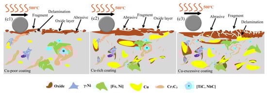 Table 8) showed high concentrations of Cu and Ni, with the high-temperature environment of 500 °C promoting the formation of dense oxides of these elements. However, the limited amount additions led to discontinuous oxide films. The dense structure and good ductility of the copper oxide and nickel oxide affected the oxide films, causing its edges to fracture into blocky, fragmented structures under the shearing force of the counterball. In the C3 coating, the higher Cu content enhanced ductility, allowing the wear debris to adhere and form a complete oxide film on the coating surface, reducing the amounts of furrows on the wear scars. However, due to the inherent low hardness of the C3 coating and the effect of thermal softening at a high temperature, significant delamination appeared on the wear scar surface. In addition, due to the complete coverage of the oxide film, loosely expanded oxides similar to iron oxide caused protrusions within the coating, as shown in