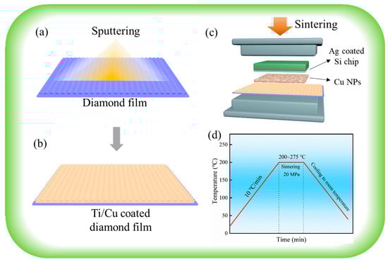 Schematic diagram of (a) sputtering on diamond film, (b) Ti/Cu-coated diamond film, (c) sintering, and (d) heating curve.