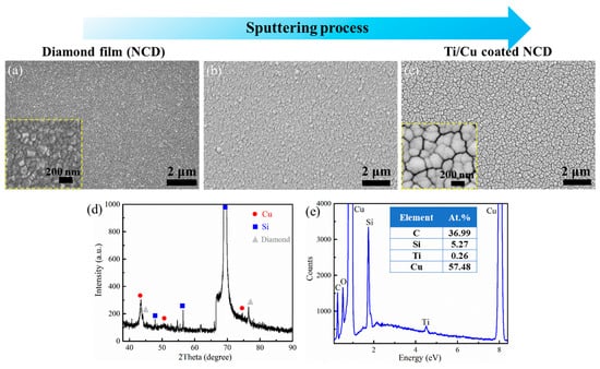 SEM images of NCD films (a) before sputtering, (b) during the sputtering process and (c) after sputtering Ti/Cu, (d) XRD and (e) EDS results of the Ti/Cu-coated NCD.