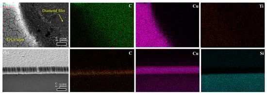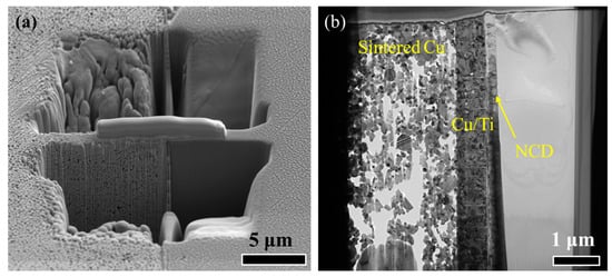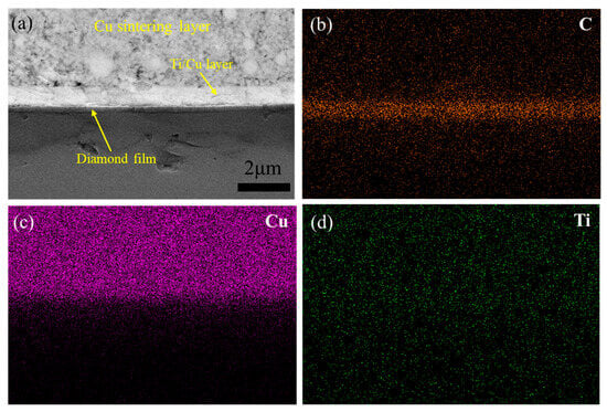 Figure 5a presents an SEM image of the sintered Cu/diamond interface, and the corresponding element map distribution is shown in Figure 5b,d. Cu can be attributed to the sintered Cu NPs and the Cu deposition layer. Ti is not clearly shown due to its low thickness (Ti will be analyzed using TEM images). Thus, the NCD/Ti/Cu/Cu NPs sintered structures can be seen at the side of the NCD interface.