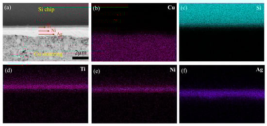 (a) Interfacial microstructures of the Si chip and sintered Cu NPs, the corresponding element map distribution of (b) Cu, (c) Si, (d) Ti, (e) Ni, and (f) Ag.