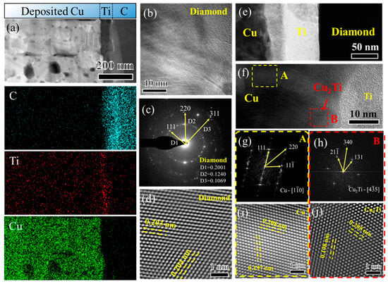 Figure 7a presents the STEM image and the corresponding element maps of the deposited Ti/Cu layer on NCD. The Cu, Ti, and C distributions indicate the interface of deposited Cu/Ti/diamond. Figure 7b displays a high-resolution transmission electron microscopy (HRTEM) image of the diamond film. The FFT (Fast Fourier Transform) patterns taken from Figure 7b are shown in Figure 7c, aligning with those of polycrystalline diamond. Figure 7d shows the IFFT (Inverse Fast Fourier Transform) image of a diamond. Figure 7e demonstrates the interface of Cu/Ti/NCD, confirming that the Ti layer is tightly bonded with NCD and the deposited Cu layer. Ti serves as an intermediate layer to ensure a stable connection between NCD and the deposited Cu layer. The HRTEM image of the Cu/Ti bilayer interface is shown in Figure 7f. The FFT patterns and IFFT image of Region A (shown in Figure 7f) are displayed in Figure 7g,i, respectively. The (111) plane of Cu can be identified, and the FFT patterns can be identified as Cu using the zone axis of [10]. For Region B marked in Figure 7f, the FFT pattern (Figure 7h) and HRTEM image (Figure 7j) point to the presence of Cu2Ti at the interface of the deposited Cu/Ti bilayer.