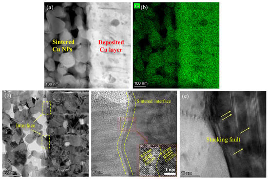The STEM image of the interface of the sintered Cu NPs and deposited Cu layer is shown in Figure 8a. Cu NPs are well bonded to the deposited layer, forming a non-continuous bonding interface. Only Cu can be clearly detected at the interface, as shown in Figure 8b. Figure 8c is the bright-field image of the interface of the sintered Cu NPs and deposited Cu layer. The bonding interface is similar to that in Figure 8a. Notably, the deposited Cu layer is composed of numerous grains with sizes smaller than 200 nm, contributing to the bonding to Cu NPs. Figure 8d presents the HRTEM image of the Cu NP/deposited Cu interface, and the inset image shows the high magnification of the selected region. The Cu (220) planes can be identified at both the sintered Cu NPs and deposited Cu layer, illustrating reliable atomic bonding. Interestingly, the stacking faults shown in Figure 8e offer a high energy state for the deposited Cu, promoting sintering [39].