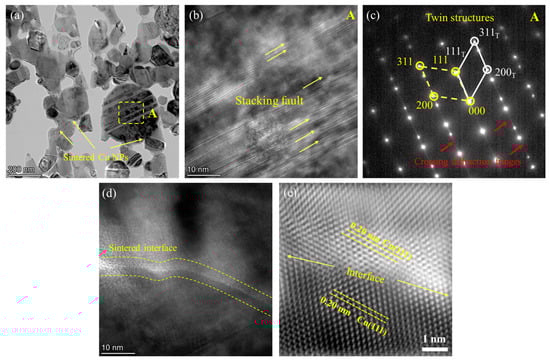 The morphologies of the sintered Cu NPs are shown in Figure 9a, in which nanoparticles with sintered necks can be observed. Figure 9b is the HRTEM image of Region A located within a particle shown in Figure 9a, where many stacking faults can be observed. Figure 9c is the SAED pattern corresponding to Region A of a Cu NP. Crossing diffraction fringes between the spots confirm the stacking faults in the nanoparticle. On the other hand, twin structures can be found; this localized distortion in the stacking faults increases the system’s internal energy. Twin crystals can reduce the system’s energy by providing low-energy interfaces that facilitate atomic diffusion. In principle, stacking faults and twin boundaries can serve as active sites during the sintering process, facilitating mass transport. In the early stages of sintering, these defective regions possess higher energy levels, which lower the activation energy and provide rapid channels for atomic diffusion, accelerating atom migration and rearrangement, thereby promoting sintering [39]. The presence of these factors can modify the local stress fields and energy landscape, promoting grain growth and improving the sintered joint’s mechanical properties. From Figure 9d, the Cu NP interface after sintering can be observed. The magnified image of the interface region is displayed in Figure 9e. The Cu (111) planes can be identified on both sides of the interface. This confirms that two Cu NPs are closely packed at the atomic scale, ensuring the reliable sintered bonding of the Cu NPs.