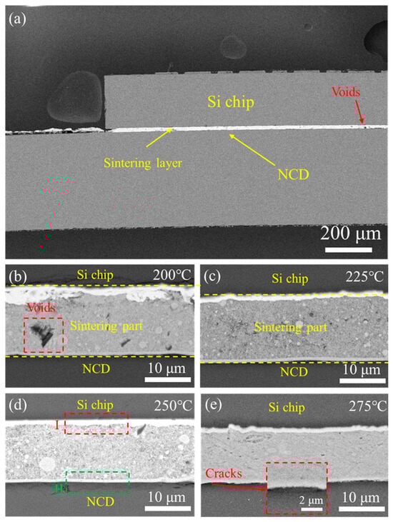 (a) Low-magnification SEM image of the sintered joint at 200 °C. Cross-sectional images of the joints sintered at (b) 200 °C, (c) 225 °C, (d) 250 °C, and (e) 275 °C.